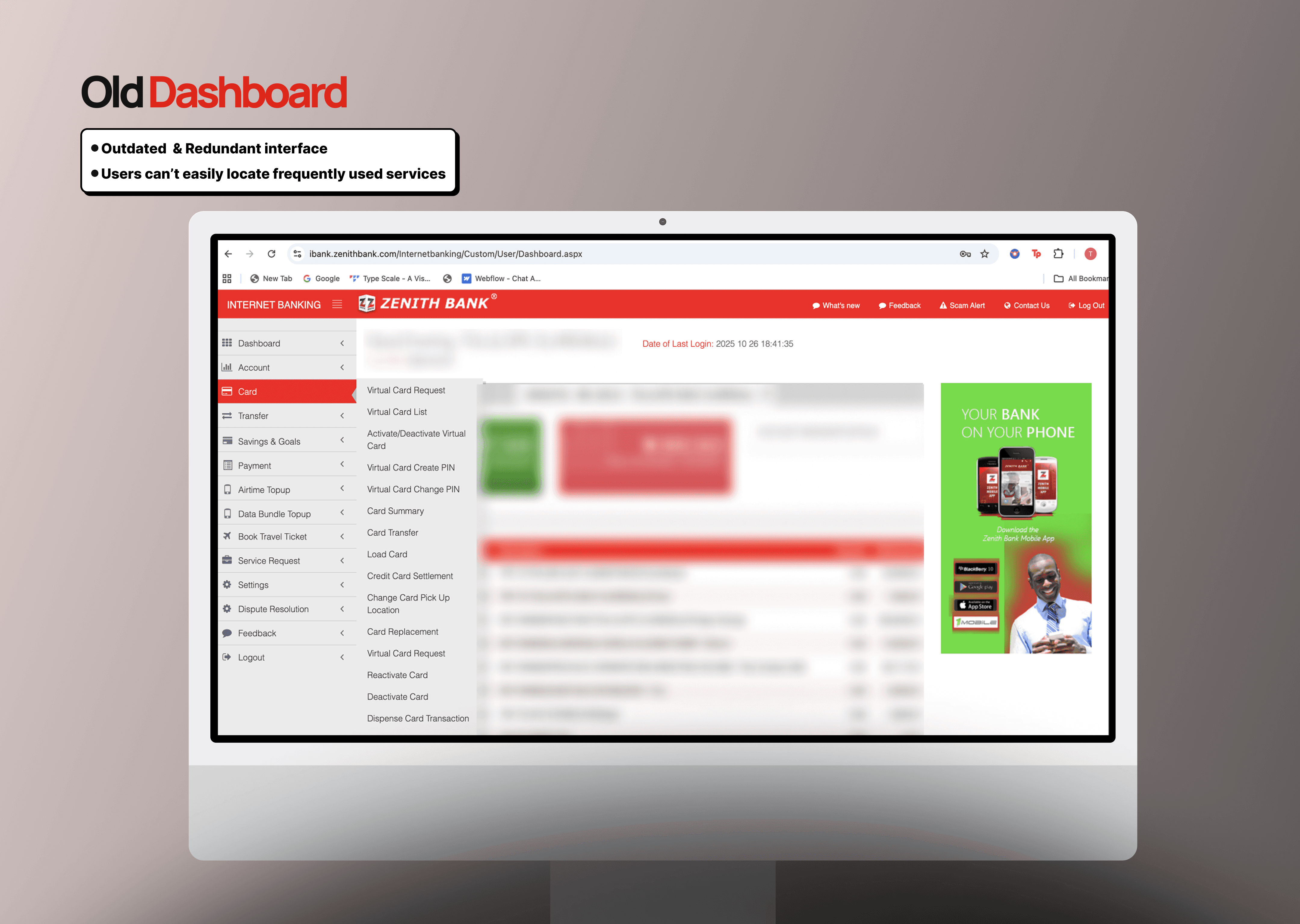 Zenith Bank’s Internet Banking platform serves as one of the gateways for customers to manage their money, make transactions, and access digital services. But as user expectations, security needs, and technology continue to evolve, the platform’s experience has started to show gaps. Insights from user feedback, analytics, and benchmarking highlight issues like usability friction, visual inconsistencies, and outdated login flows. To stay competitive and build trust, a redesign is essential — not just for a visual refresh, but to create a more secure, seamless, and intuitive experience that improves engagement, reduces drop-offs, and aligns with modern UX and security standards.